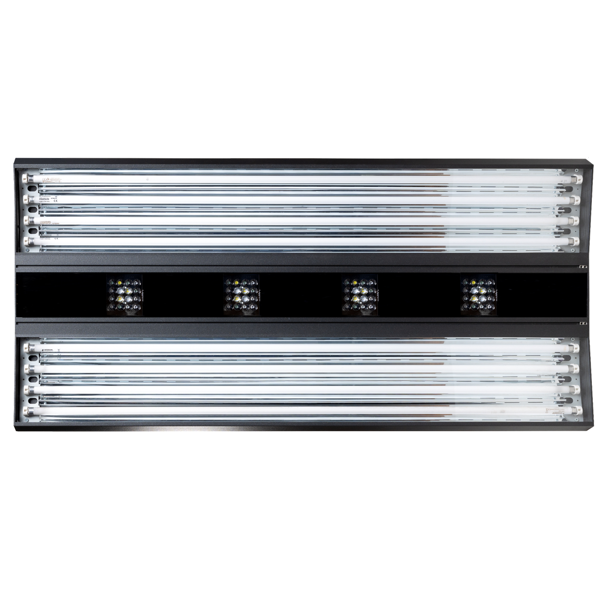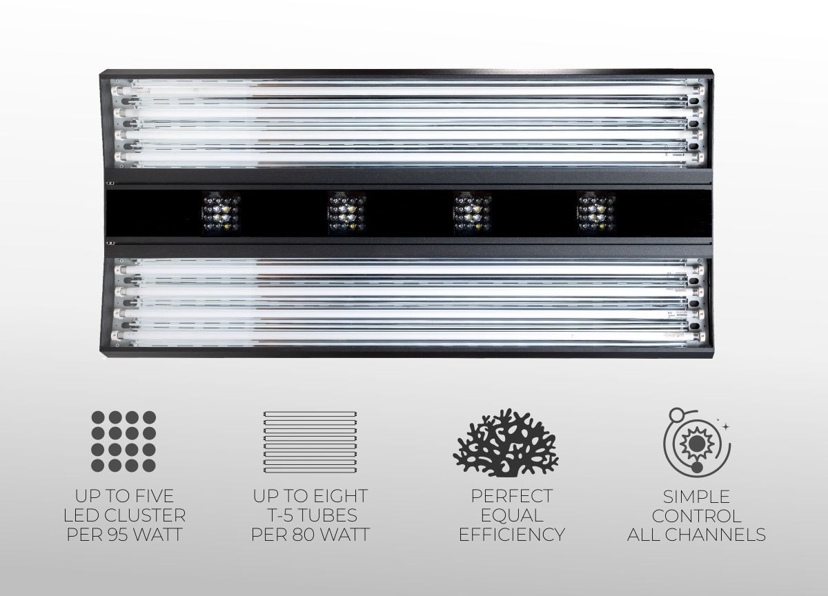 Met tot 5 krachtige LED-clusters met elk een maximaal vermogen tot 95 watt wordt al een buitengewone lichtopbrengst bereikt. Deze LED clusters worden aangevuld met maximaal 8 dimbare HO T-5 lampen, elk in groepen van 2 dimbaar van 0-100%. U bepaalt zelf de exacte lichtmix.