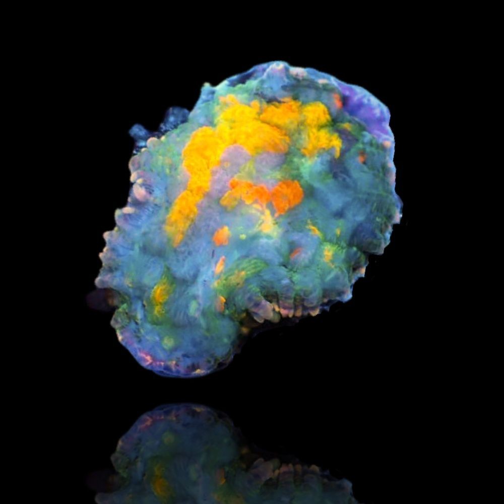 De Rhodactis Orange Patchwork is een opvallende paddestoelkoraal die direct de aandacht trekt dankzij het unieke patroon van oranje, groen en soms paarse tinten die samen een prachtig patchwork-effect vormen. Dit koraal schittert extra mooi onder actinisch of blauw LED-licht en voegt een levendig en decoratief accent toe aan elk rifaquarium.