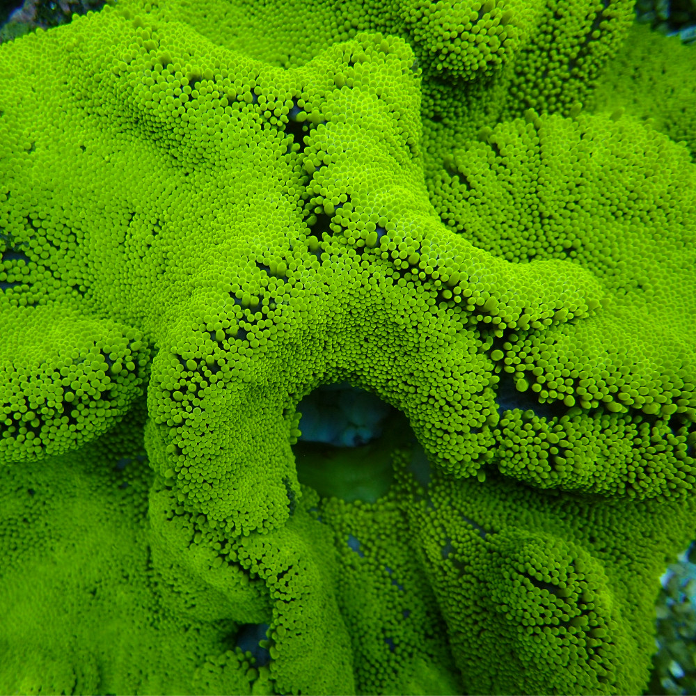 De Stichodactyla Gigantea, ook wel bekend als de Green Carpet Anemone, is een indrukwekkende, bodembedekkende anemoon die zich onderscheidt door zijn felgroene kleur en dichte, korte tentakels die lijken op een zacht tapijt. Deze soort is bijzonder geliefd vanwege de symbiotische relatie die het kan aangaan met diverse clownvissoorten, waaronder de populaire Amphiprion ocellaris en Amphiprion percula.