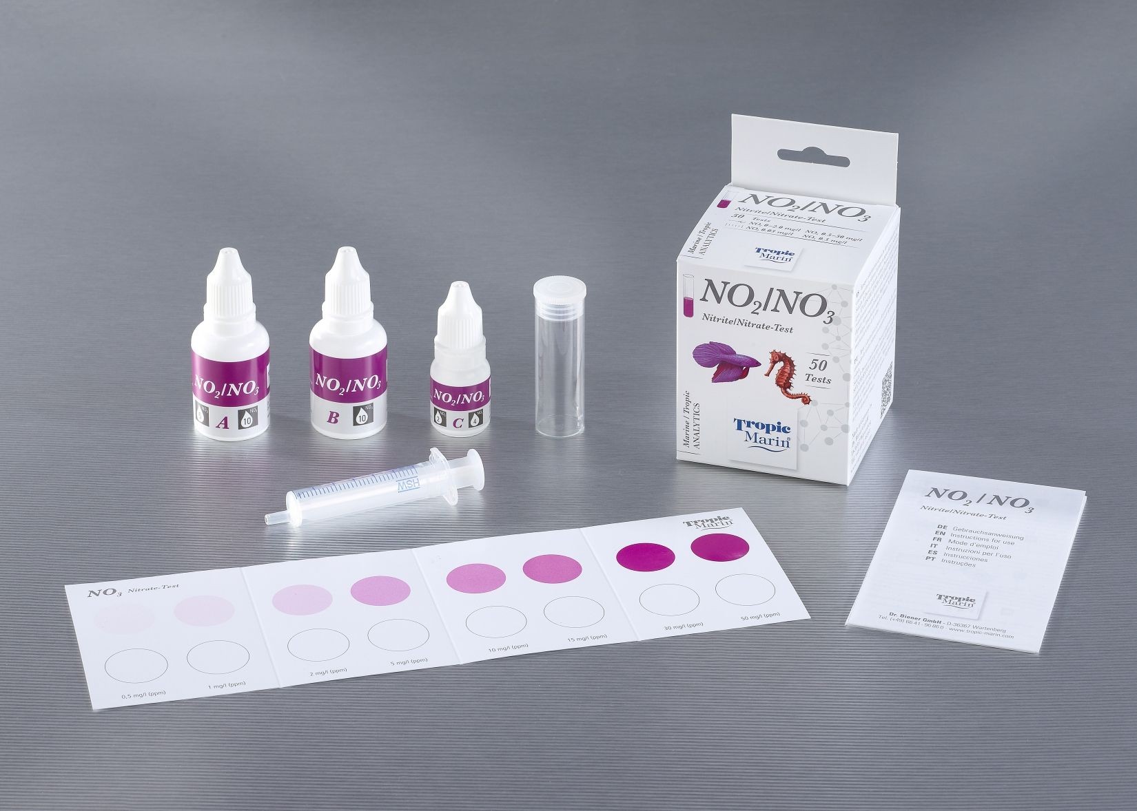 Met de Tropic Marin® Nitriet / Nitraat-Test kunnen de nitriet- en nitraatconcentraties worden bepaald met behulp van een fijn afgestemde kleurenkaart met een bereik van concentraties voor nitriet tussen 0 - 2 ppm en voor nitraat tussen 0 - 50 ppm. Geschikt voor zoet- en zoutwater