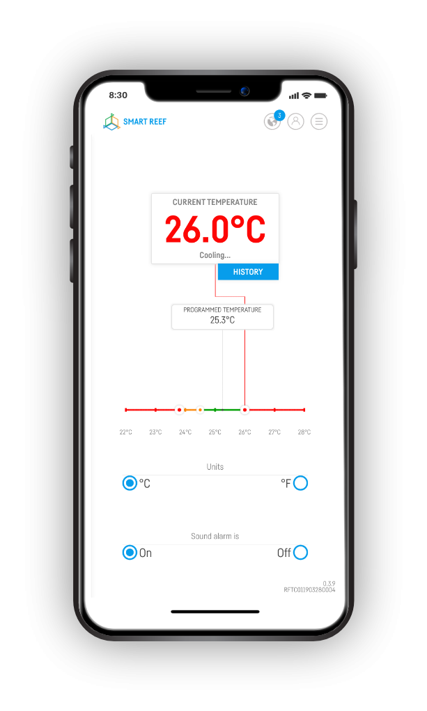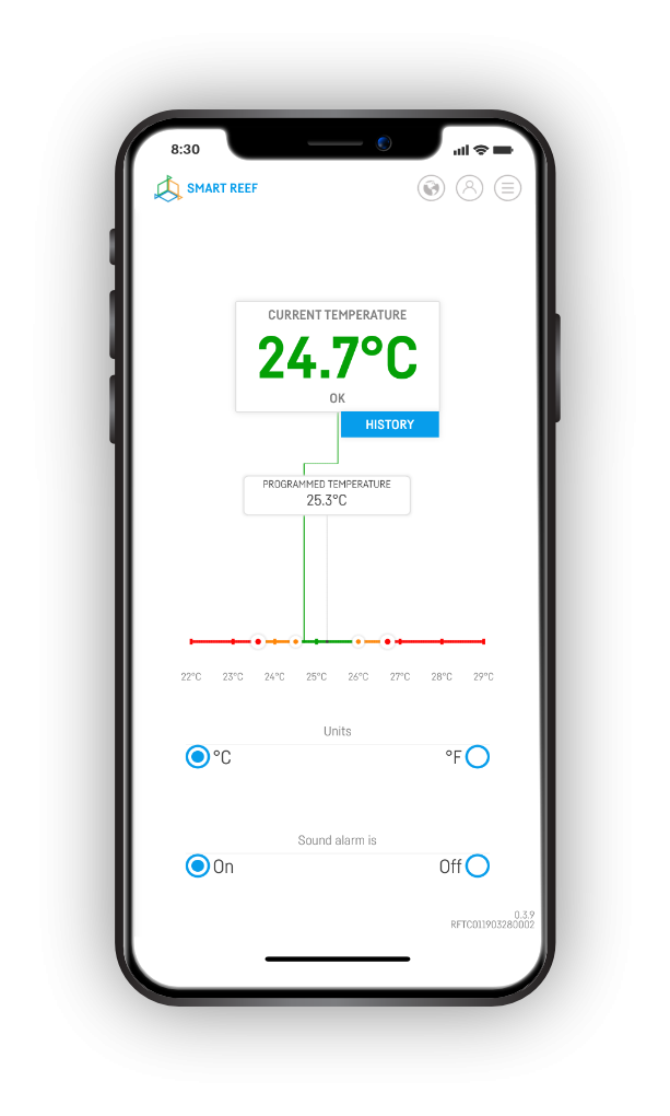 De gegevens kunnen online worden weergegeven en het apparaat kan via een browser op een laptop of een app op een telefoon ingesteld worden. De temperatuur wordt duidelijk weergegeven. Het apparaat bedient de verwarmings- en koelingssystemen en houdt een aangegeven temperatuur vast. Daarnaast kun je je aquarium beveiligen door meldingen in te stellen die worden ingeschakeld als bepaalde temperaturen worden bereikt. Nadat het systeem is aangesloten op het Smart Reef-systeem, kun je sms-berichten direct op je telefoon ontvangen als de temperatuur boven of onder een aangegeven waarde komt.