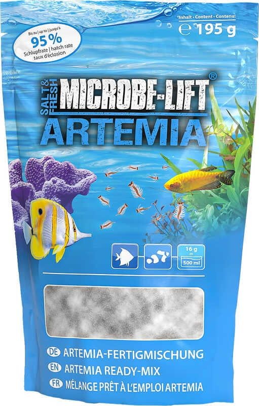 Het buffet is geopend! Artemia voorziet uw lievelingen van het fijnste verse levend voer: Het gebruiksklare mengsel van zout en Artemia-eieren zorgt in een mum van tijd voor heerlijke, verse Artemia-garnalen - ideaal voor het voeren van koralen, lagere dieren en vissen.