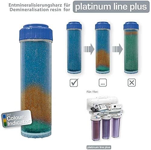 - Wegwerp hars. De hars is voorzien van een kleurindicator die de efficiëntie van het filtermateriaal aangeeft. Als de geleidbaarheid van het ontzoute osmosewater begint te stijgen (stijgende TDS-waarde), verkleurt de hars van blauw naar groen en moet deze worden vervangen.