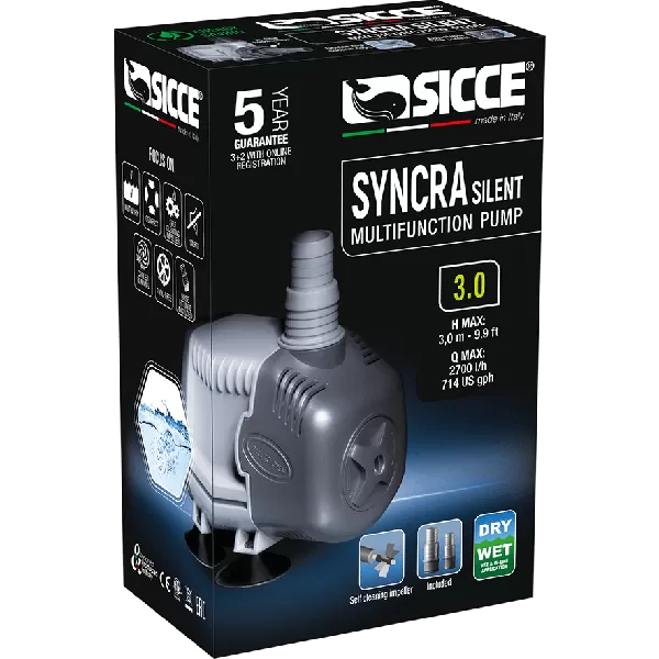 Sicce Syncra 3.0 is een krachtige en stille multifunctionele pomp, ontworpen voor zowel natte als droge toepassingen. Dankzij de energiezuinige motor en betrouwbare prestaties is deze pomp ideaal voor aquaria, fonteinen en andere waterinstallaties.