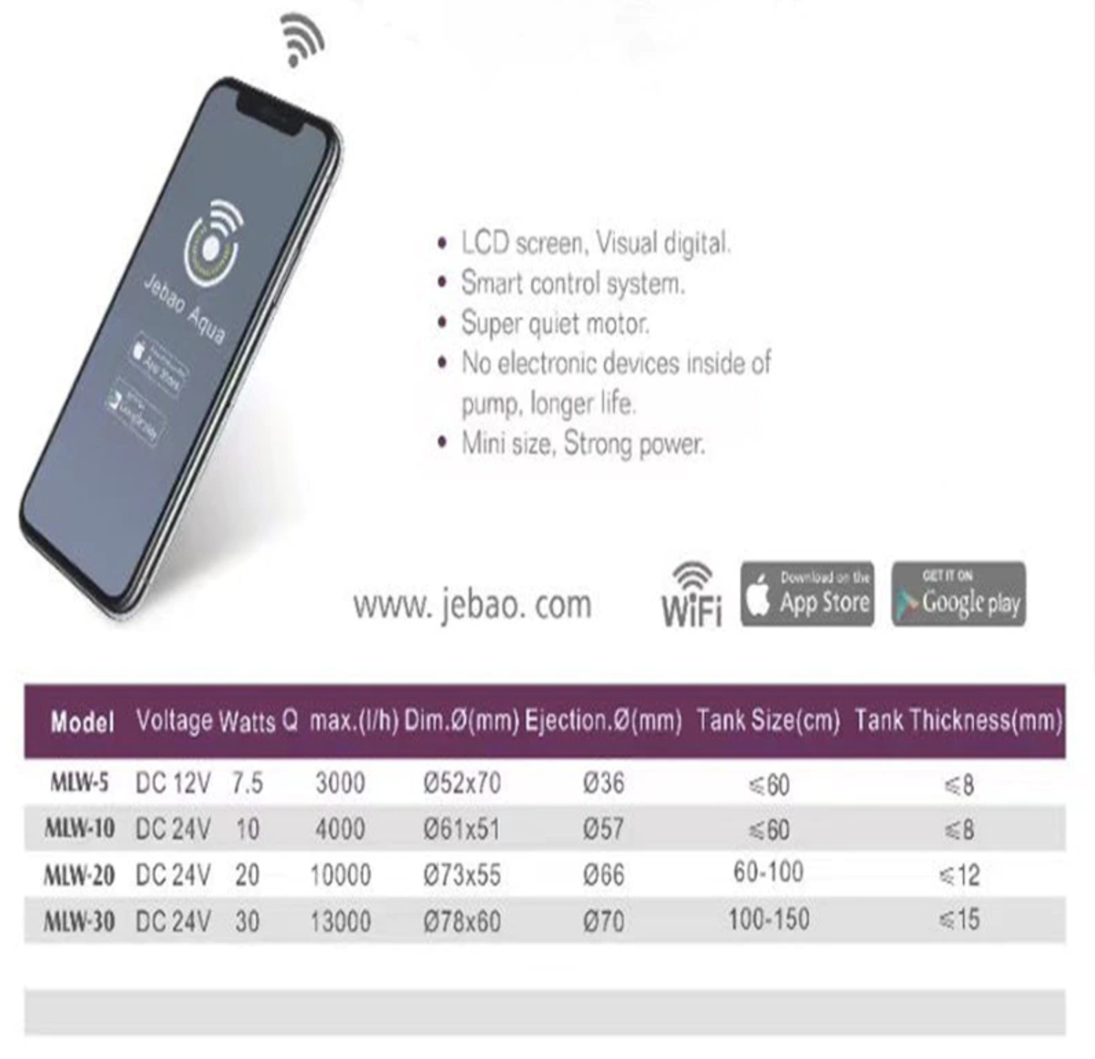 De Jecod/Jebao MLW-5 stromingspompen (sine wave) met WiFi en LCD display is de nieuwste pomp van Jecod/Jebao met een zeer brede difuse uitstroom wat resulteerd in nagenoeg geen plekken waar geen stromings is. Deze stromingspompen worden geleverd met een controller (Externe aandrijfregelaar). Het grote voordeel van deze nieuwe pompen is dat er geen elektronische componenten met in de pomp zitten, maar dat alles nagenoeg in de controller zit. Tevens beschikken deze nieuwe pompen over sine wave techniek wat resulteerd in een zeer stille werking. Door deze twee nieuwe features hebben de pompen ook een langere levensduur.