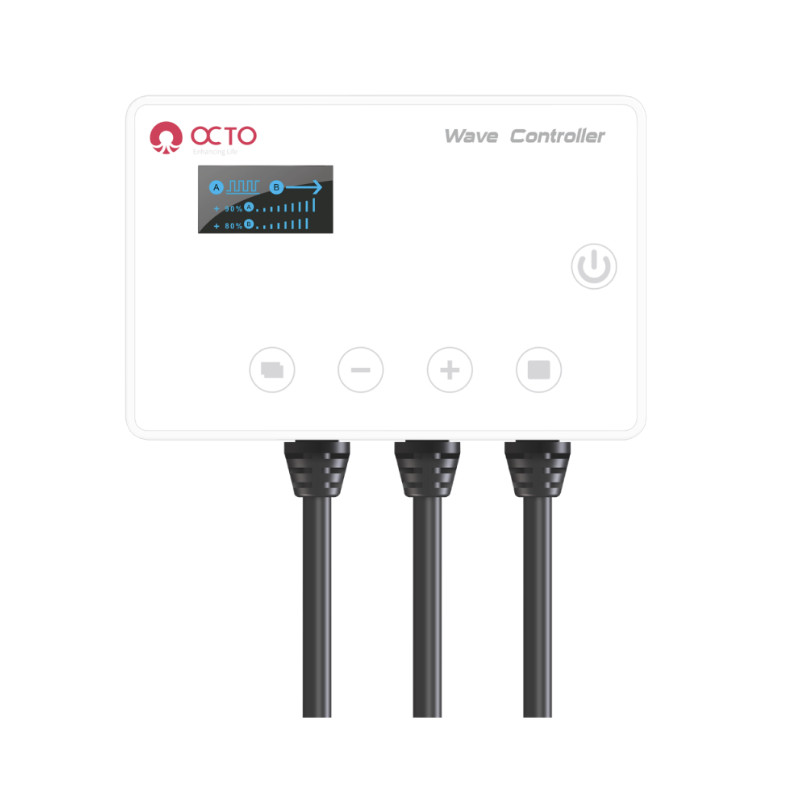 Onze nieuwe WiFi-besturingsunit kan nu *twee golfpompen tegelijk van stroom voorzien en de instellingen tussen deze twee golfpompen eenvoudig aanpassen via onze op maat gemaakte OCTO-app, die beschikbaar is voor zowel IOS- als Android-apparaten.