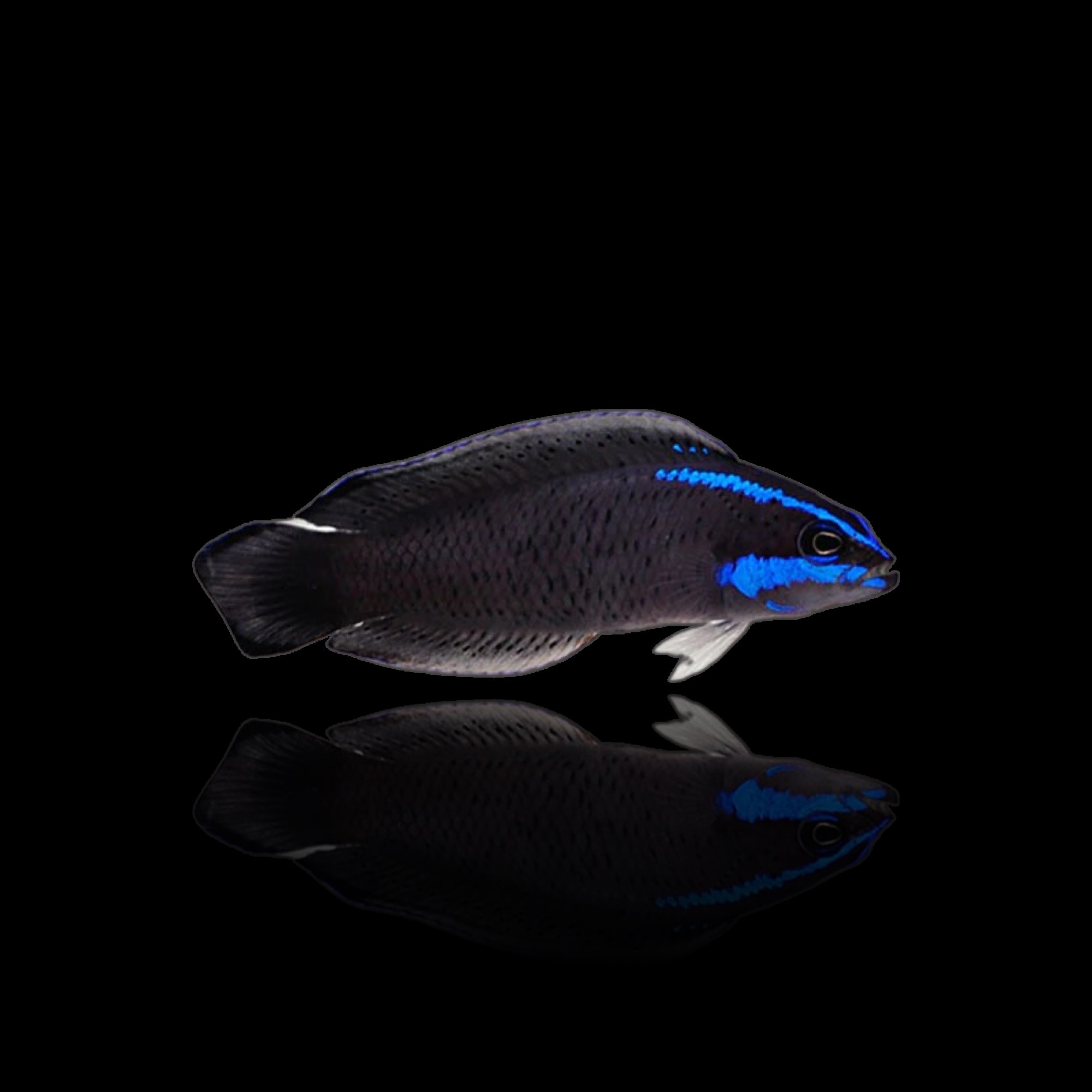 De Springeri Dottyback, ook wel bekend als de blauwe dwergbaars, is voornamelijk donkerblauw met drie verticale gezichtsstrepen van lichtblauw en diepblauwe contouren op de vinnen. Een zeer nieuwsgierige vis met een kenmerkende persoonlijkheid, de springerii zal jarenlang plezier bieden voor de zeewaterliefhebber.