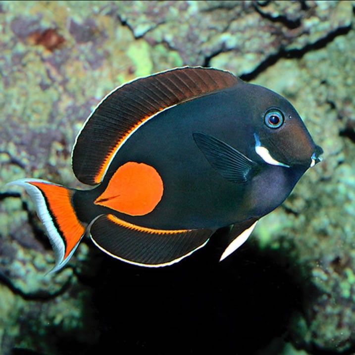 De Acanthurus Achilles, in de volksmond ook wel Bloedvlek Doktersvis genoemd, is een van de meest iconische en begeerde rifvissen. Met zijn elegante zwarte lichaamskleur, contrasterende oranje markeringen en levendige witblauwe accenten is hij een ware blikvanger in het aquarium.