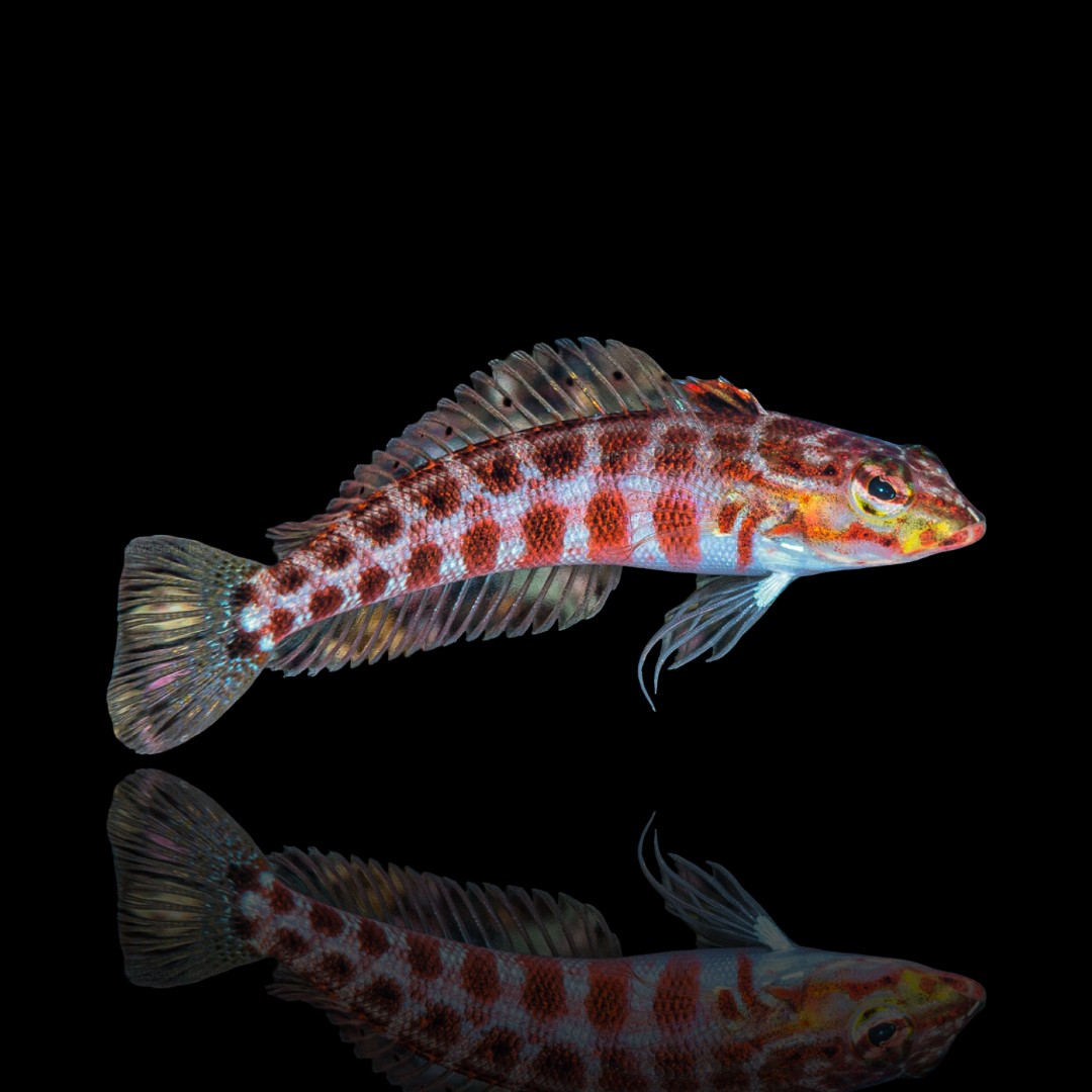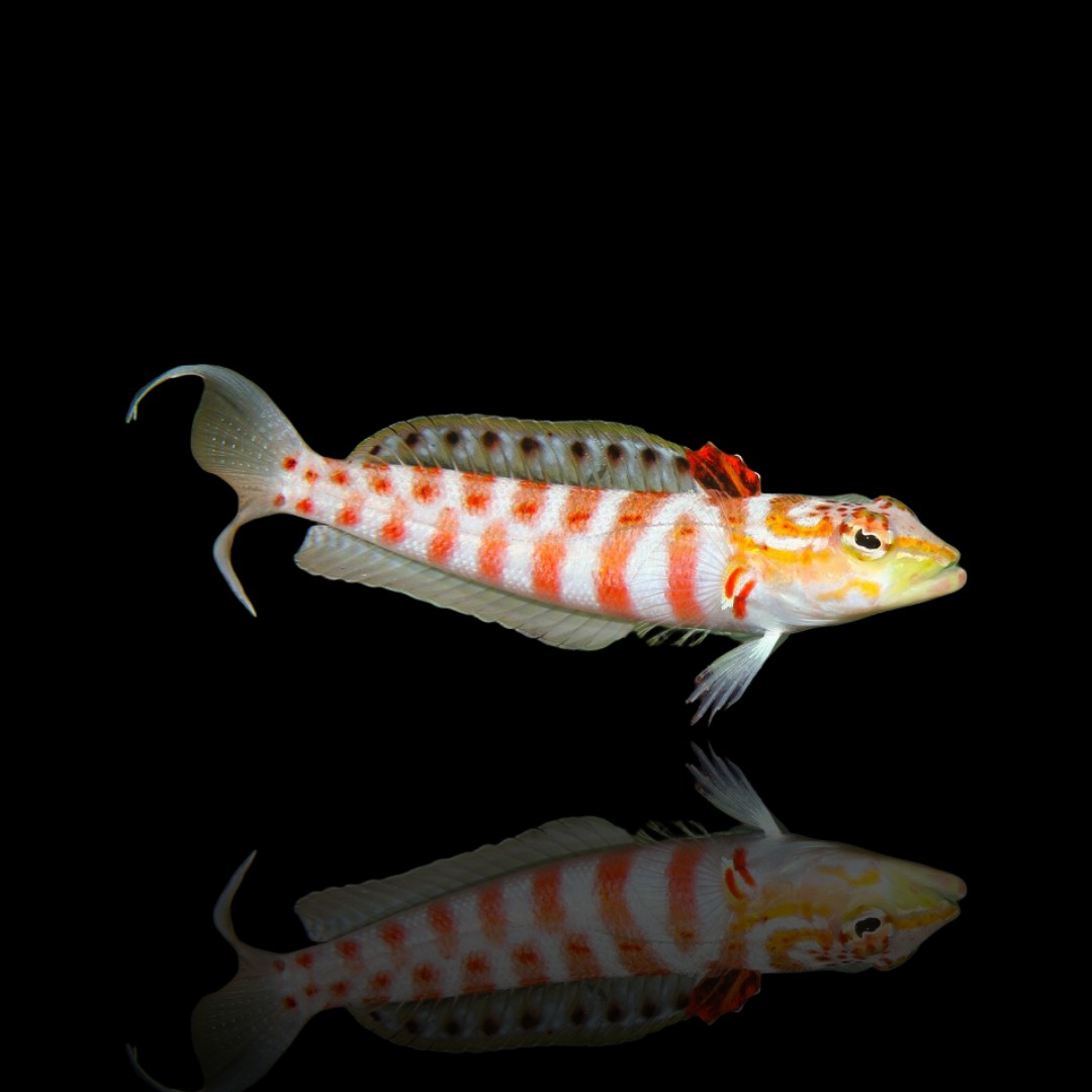 De Parapercis schauinslandi, beter bekend als de Roodvlek Zandbaars, is een elegante en minder vaak aangeboden rifvis die voornamelijk voorkomt op zand- en puingebieden rond het rif. Deze soort valt op door zijn fijne patroon van roodbruine vlekken en lijnen op een lichtgekleurde basis, wat zorgt voor een natuurlijke camouflage tegen de zandbodem.