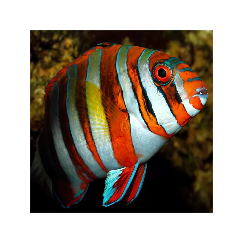 De Choerodon fasciatus uit Australië, beter bekend als de Harlekijn Tuskfish, staat bekend om zijn bijzonder intense kleurcontrast. In vergelijking met andere herkomsten toont de Australische variant vaak diepere blauwtinten in de strepen en een krachtiger oranje basis, wat hem visueel nog indrukwekkender maakt.