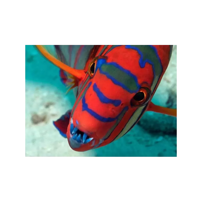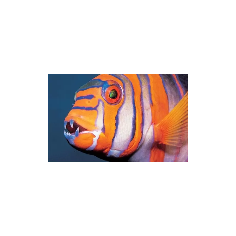 De Choerodon fasciatus, beter bekend als de Harlekijn Tuskfish, is een indrukwekkende lipvis die direct opvalt door zijn horizontale blauwe strepen op een oranje tot roodbruine achtergrond. De felblauwe tanden, waaraan hij zijn bijnaam “Tuskfish” dankt, geven deze vis een krachtige en unieke uitstraling.
