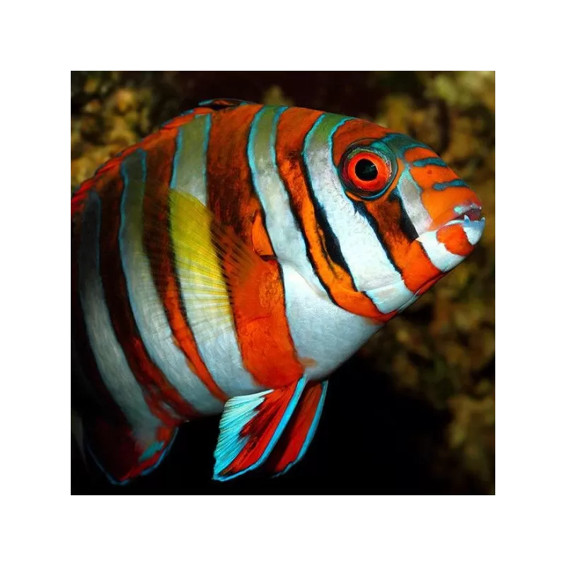 De Choerodon fasciatus – Harlekijn Tuskfish is een krachtige en kleurrijke zeevis die een dominante en opvallende aanwezigheid heeft in het aquarium. Dankzij zijn unieke kleurpatroon, blauwe tanden en actieve gedrag is deze soort een spectaculaire keuze voor ervaren aquarianen met een groot zeeaquarium en robuuste medebewoners.