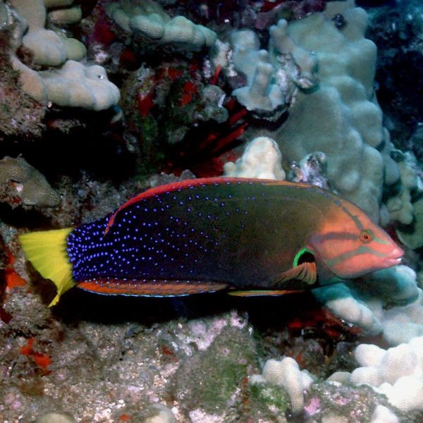 - Veelvoorkomende naam: Rode Regenbooglipvis / Yellowtail Coris Wrasse
