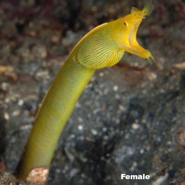 Juveniles zijn zwart met een gele vin.Vrouwtjes zijn helemaal geel met een zwarte vin, en de mannetjes zijn blauw met een gele snuit en onderkaak.