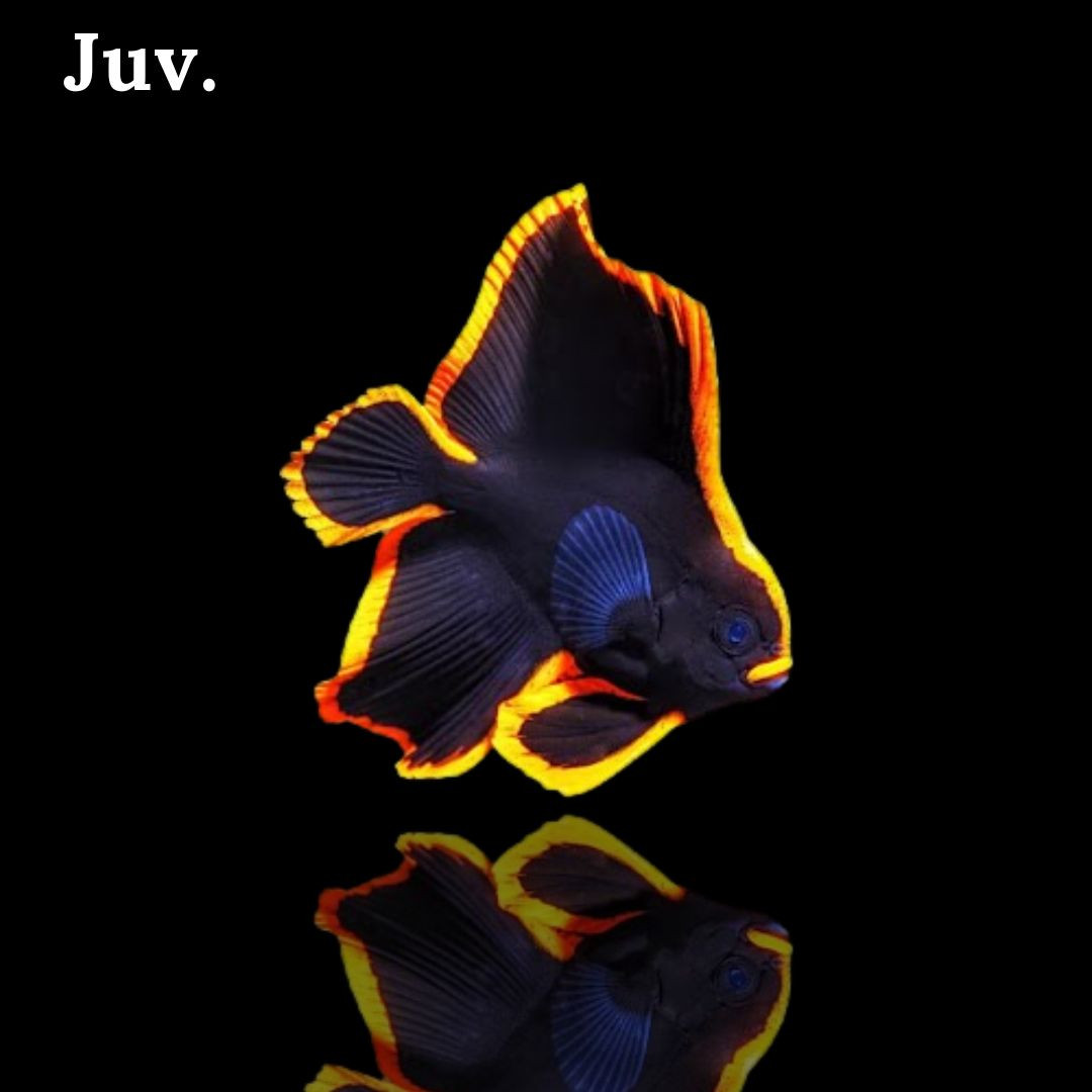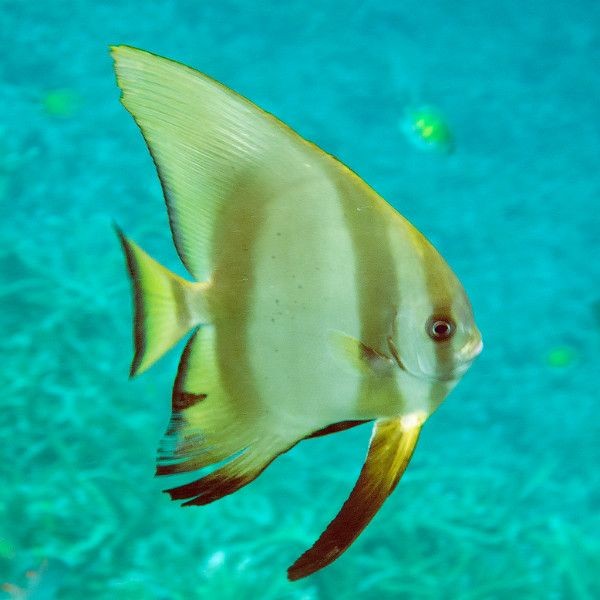Platax pinnatus, algemeen bekend als de Dusky batfish, is een grote vleermuisvis die alleen geschikt is voor de grootste thuistanks en dierentuinen. Als juvenielen behoren ze tot de mooiste vissen ter wereld! Ze hebben een gitzwart lichaam met een heldere oranje omlijning rond de hele vis. Gecombineerd met hun grote, lange vinnen zijn deze vissen zo indrukwekkend als ze maar kunnen zijn. Helaas blijven ze niet op deze manier... Als volwassenen verliezen ze de grote vinnen, worden ze meer afgerond en zilverachtig met brede donkere verticale banden.