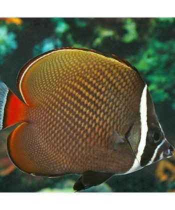 De Chaetodon collare, ook wel bekend als de Rode Maskervlinder of witkraag koraalvlinder, is een elegante vlindervis met een uniek kleurpatroon. Zijn donkerbruine lichaam is bedekt met fijne lichtgekleurde schubbenranden, terwijl de kop wordt gesierd door een rood masker en een witte band. De staartvin heeft een opvallende rode rand, wat deze soort een luxueuze uitstraling geeft.